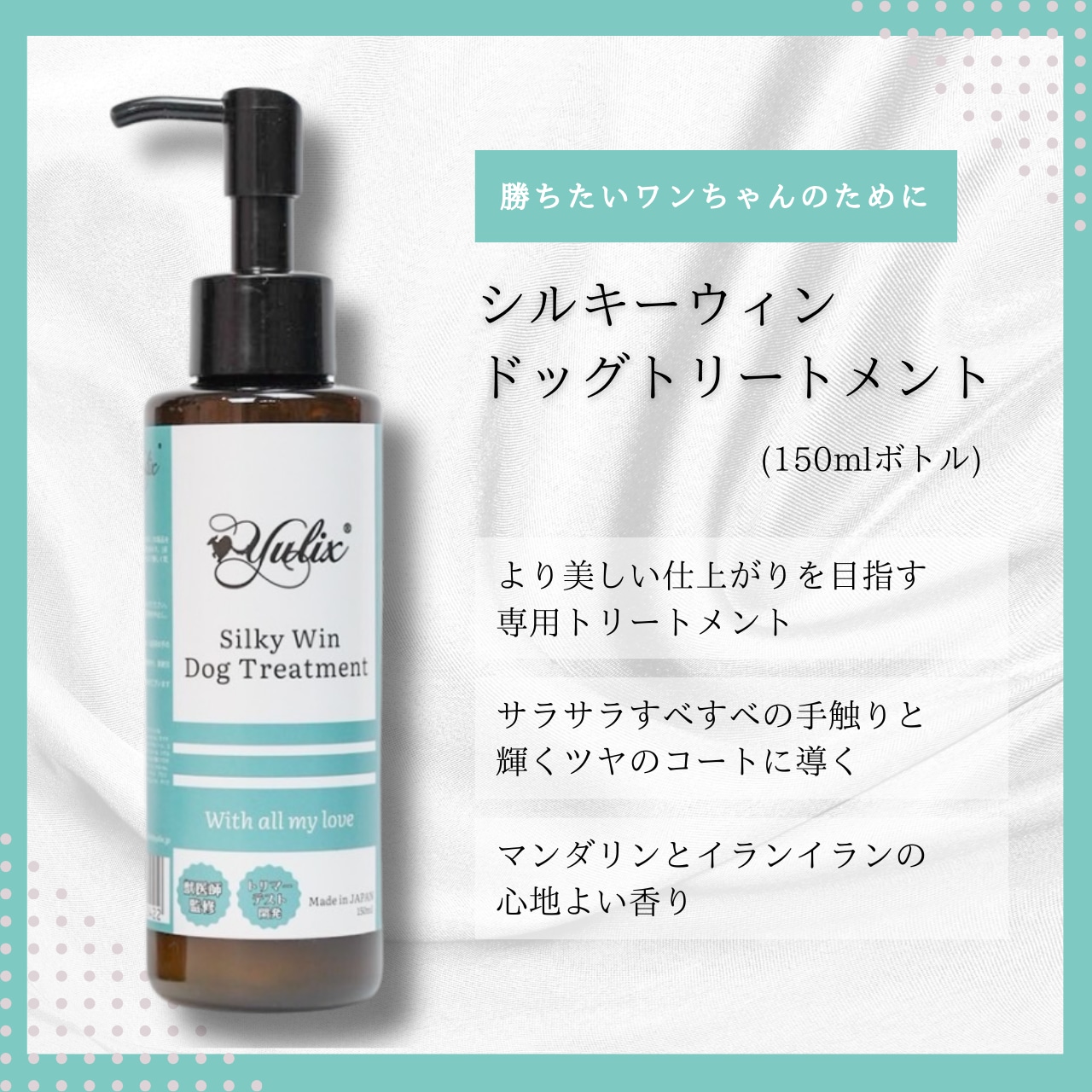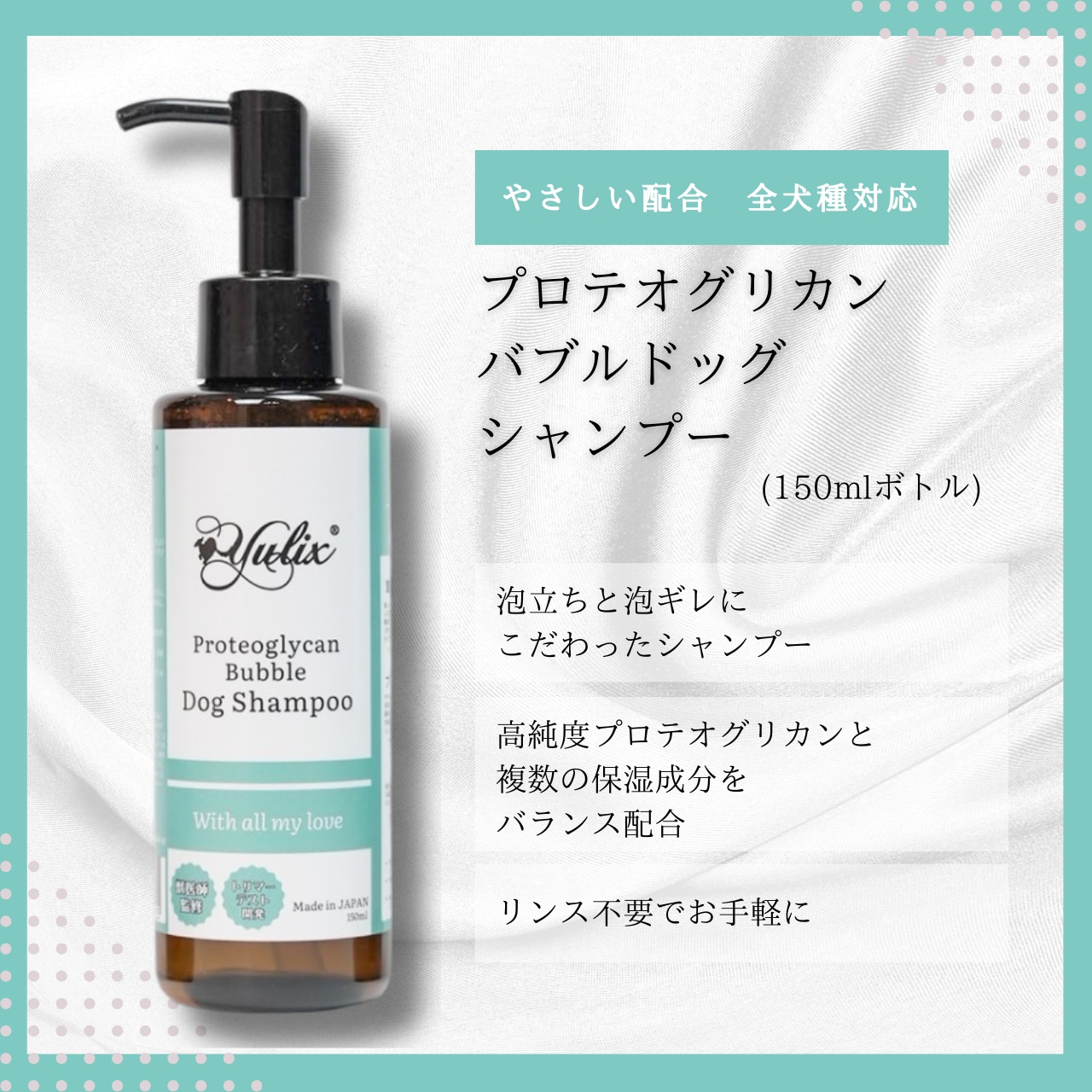 使用 Yulix 的兩款狗狗專用洗髮精,打造出乾淨亮麗的毛髮,並讓毛髮更加光澤、柔順如絲滑般的觸感。